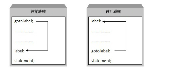 在这里,label 可以是任何除 C 关键字以外的纯文本,它可以设置在 C 程序中 goto 语句的前面或者后面。