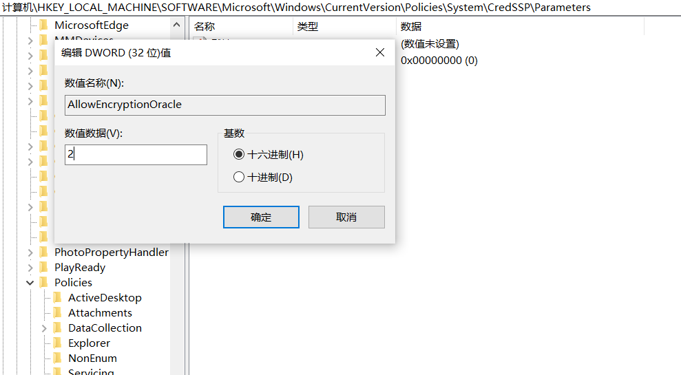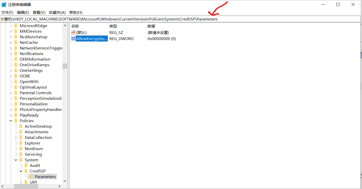 计算机\HKEY_LOCAL_MACHINE\SOFTWARE\Microsoft\Windows\CurrentVersion\Policies\System\CredSSP\Parameters