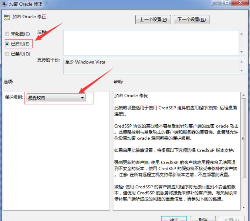 • 选择启用并选择易受攻击,配置保存后即可解决问题。